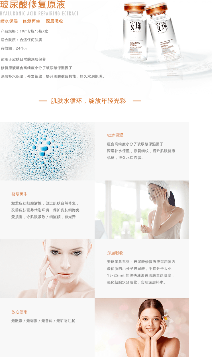 適用于皮膚日常的深層保養(yǎng),修復(fù)原液蘊含高純度小分子玻尿酸保濕因子, 深層補水保濕,修復(fù)細紋,提升肌膚健康機能,持久水潤飽滿。