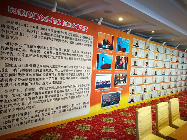 此次座談會延承了2016年12月在上海召開的中國直銷行業規范發展國際交流研討會的精神,播放了《59家直銷企業簽署自律承諾宣言》宣傳短片,并舉辦了相關展覽。在上海會議上,三八婦樂及58家直銷企業共同簽署了《自律承諾宣言》。承諾宣言包括了保護消費者權益、守法、誠信、規范經營等十個方面的內容。
