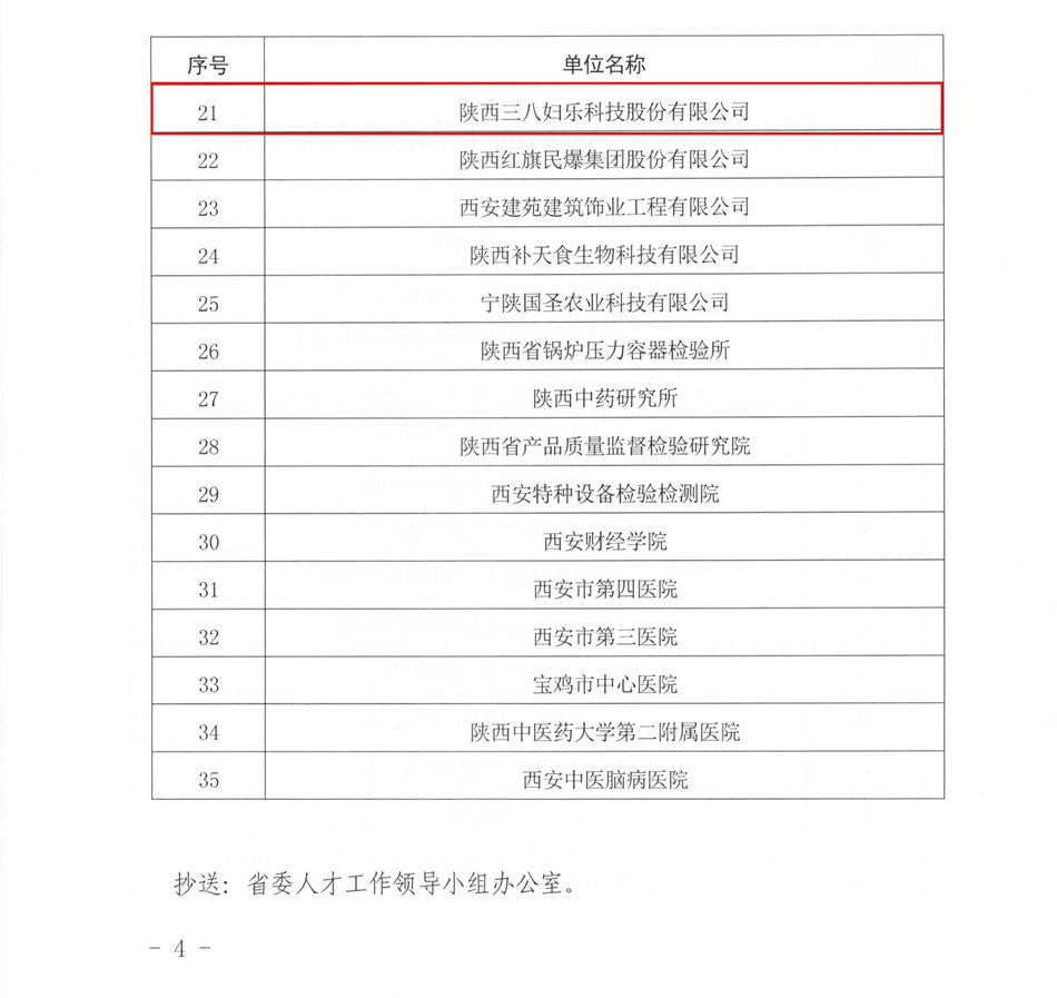 日前,陜西省人力資源和社會保障廳發布了2017年陜西省博士后創新基地名單,陜西三八婦樂科技股份有限公司成功入選。