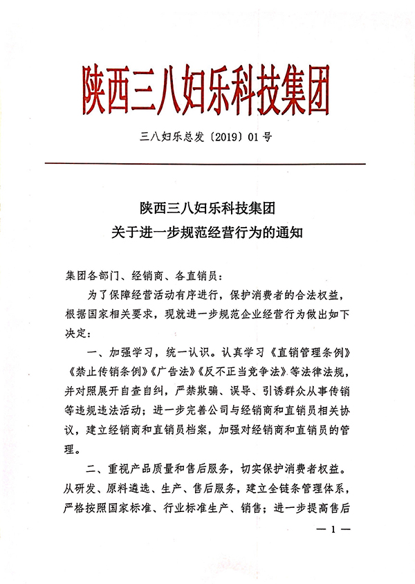 陜西三八婦樂科技集團關于進一步規范經營行為的通知