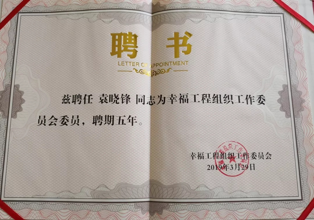 三八婦樂袁曉峰擔任幸福工程全國組織工作委員會委員