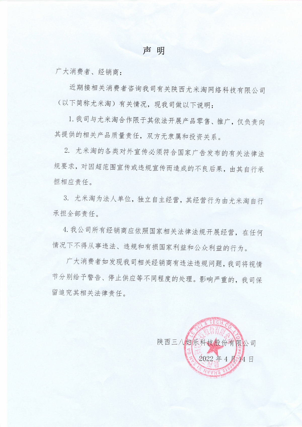 陜西三八婦樂科技股份有限公司聲明